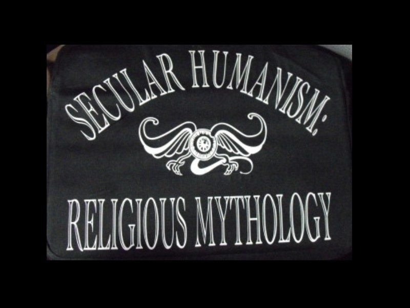 “Secular Humanism: Religious Mythology” is lettered on my computer bag. So “What is Secular Humanism?” The quick, simple answer is that it is the religion of self-indulgence with no possible consequences for the way we live in any kind of life after death. Beginning somewhere around the Kennedy administration, Secular Humanists learned that if they lied and claimed that they weren’t a religion, they could get federal funds. They also got political power to force everyone to practice their religion. The following more complete definition is from our book Antidisestablishmentarianism.