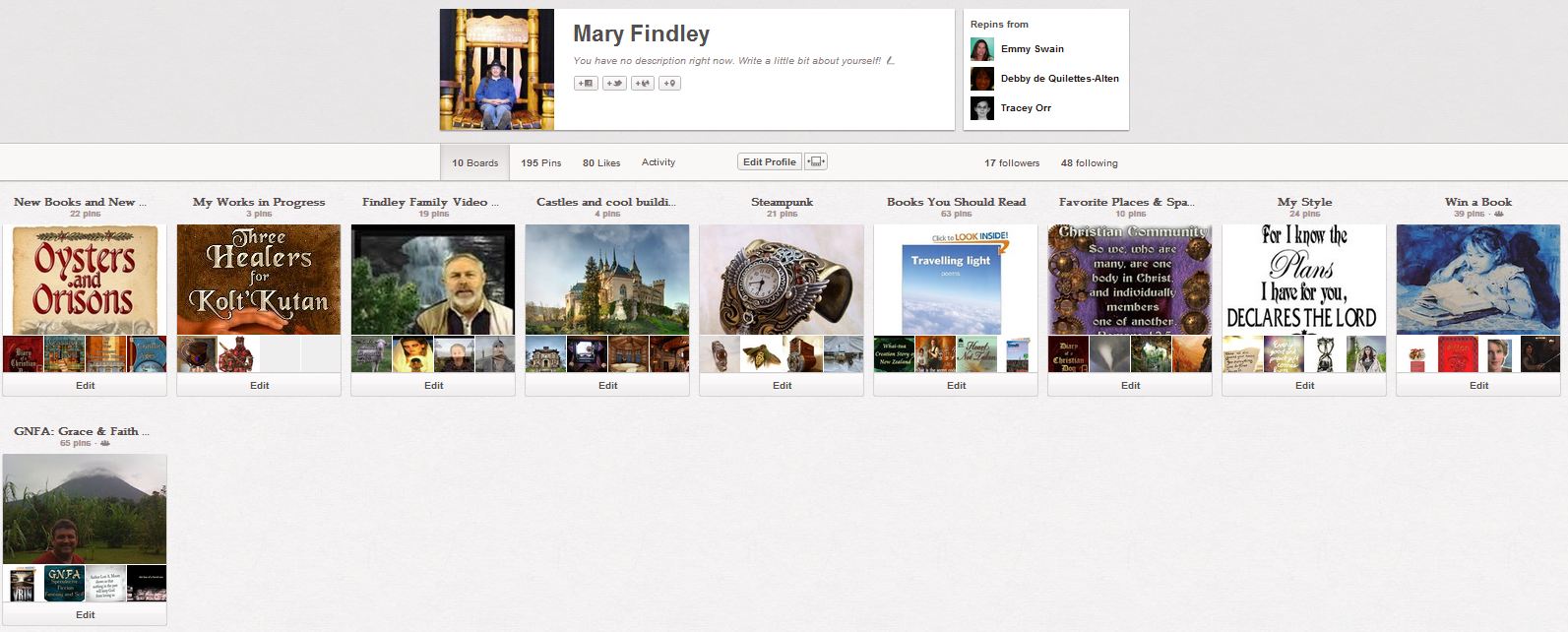 I have only “discovered” Pinterest within about the last month. Previously, I knew that non-writing friends, especially females, gushed about it. Sometimes I ignore what females gush about because it usually has to do with shopping and I dislike shopping. One friend said she couldn’t believe I would be on Pinterest. But several author friends poked me (Sorry, can’t help it) with urges to check it out, and see if it could be used as a marketing tool. We had a contest there for a book giveaway for another author and had lots of fun trying to add related items to the board along with her website, artwork and book pins. Not sure how she made out in term of sales results, but I did discover one really odd thng about Pinterest. I discovered this about Twitter, too, and it still puzzles me. If you follow people, like their stuff, and repin, people come see your stuff, and sometimes like and follow it as well.