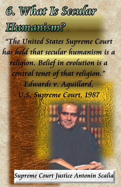 “The United States Supreme court has held that secular humanism is a religion. Belief in evolution is a central tenet of that religion.” (Edwards v Aguillard U.S. Supreme Court 1987. Justice Antonin Scalia.)