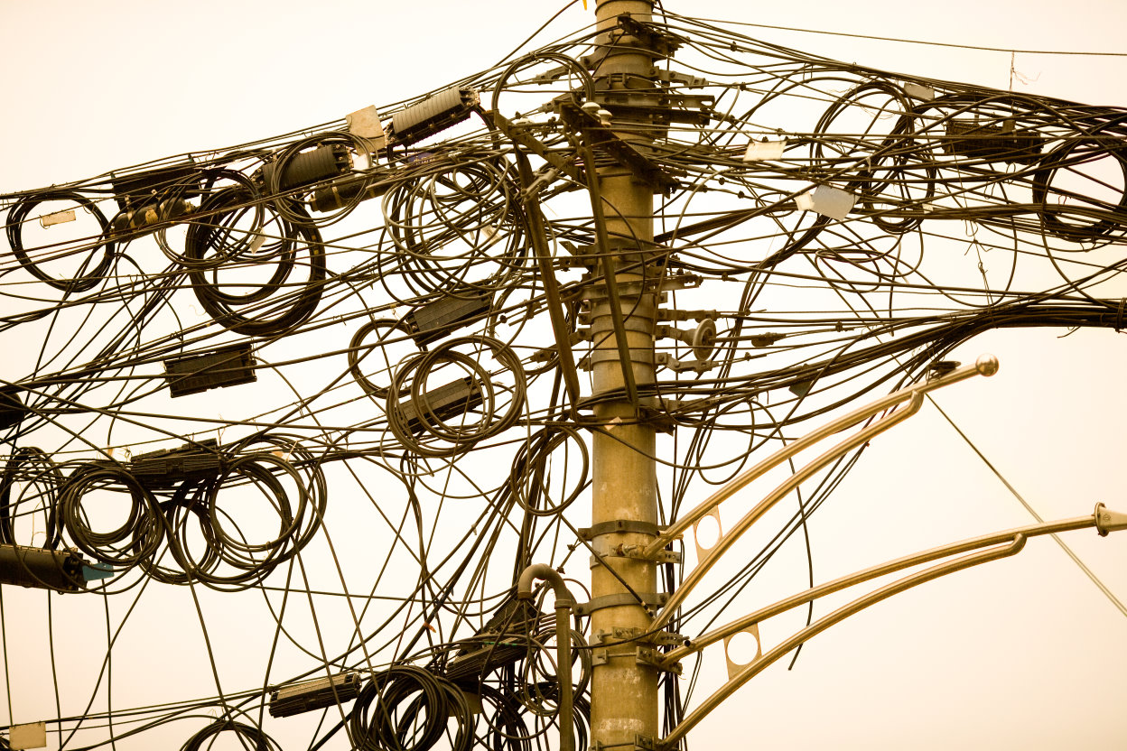 A tangle of cables and wires in Shanghai, China