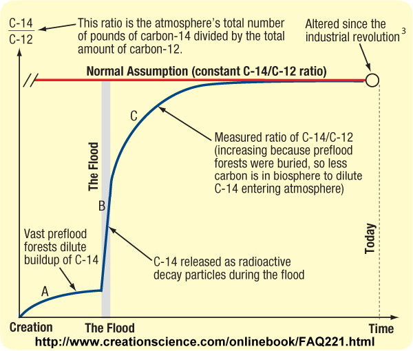 First, 14C dating relies on analysis of the ratio of 14C to 12C in a sample. Accurate radiocarbon dating is a complex process. The YEC position is that the volcanic processes during the 2350 BC global flood added so much 12C to the global environment from CO2 that any sample taken soon after the flood would have considerably more 12C than any sample from the past 2600 years, when equilibrium was established after the flood.