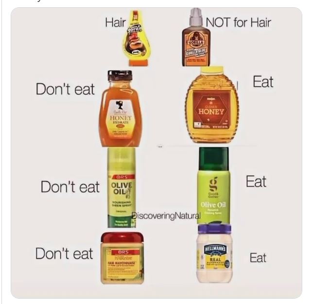 As I mentioned, this woman used a product called “Got2B glued hairspray,” so it’s possible she was genuinely confused. (As I side note, I found this image under an Ulta site caption celebrating Black History Month. I’m not sure what to say about that.) She came to the internet for help and got a lot of ridicule before finally getting actual help. I’m including an image of some hair care products to show you it truly can be confusing and hard for people to know what’s safe and what isn’t. The product on the top left even has “Gorila” as part of the name.
