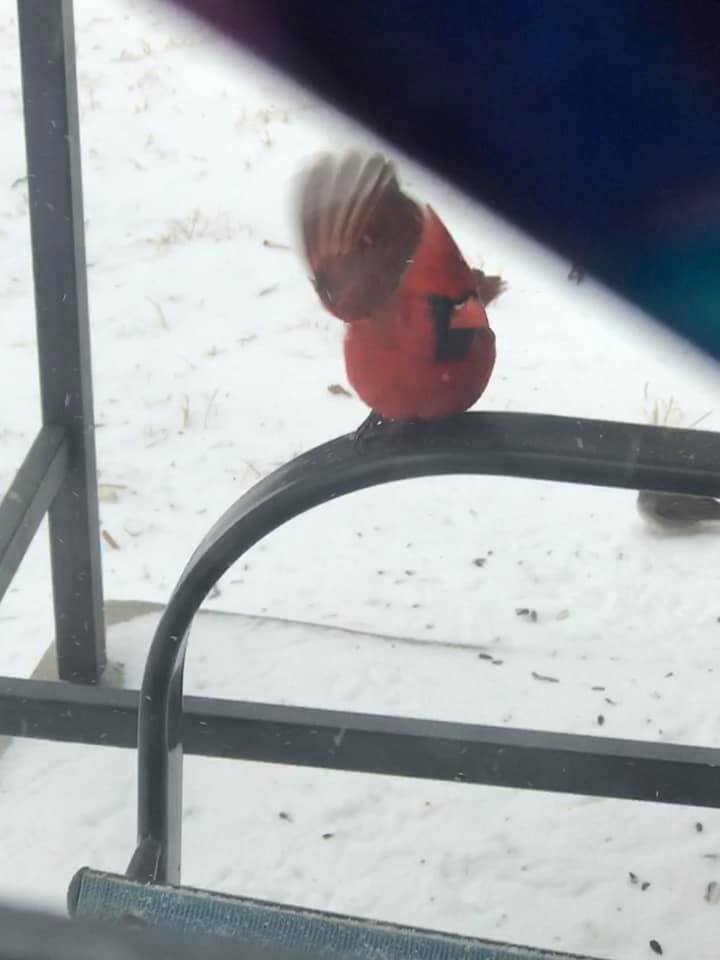3. Kitties to love and watch birds with. Sooo many birds taking advantage of our tabletop seed program. Cardinals, juncos, sparrows, black birds of various kinds, blue jays … so, so many. Our cats are ecstatic about the window views from the cat tree. And we had a junco tree when several perched on Vicky’s peach tree.
