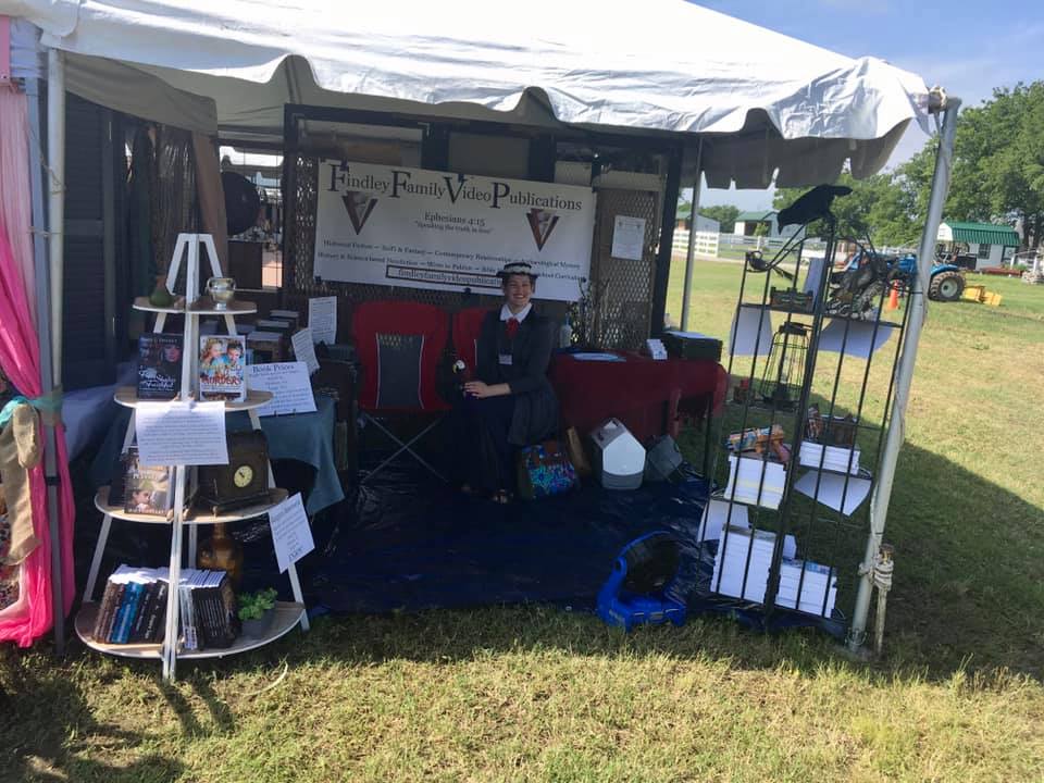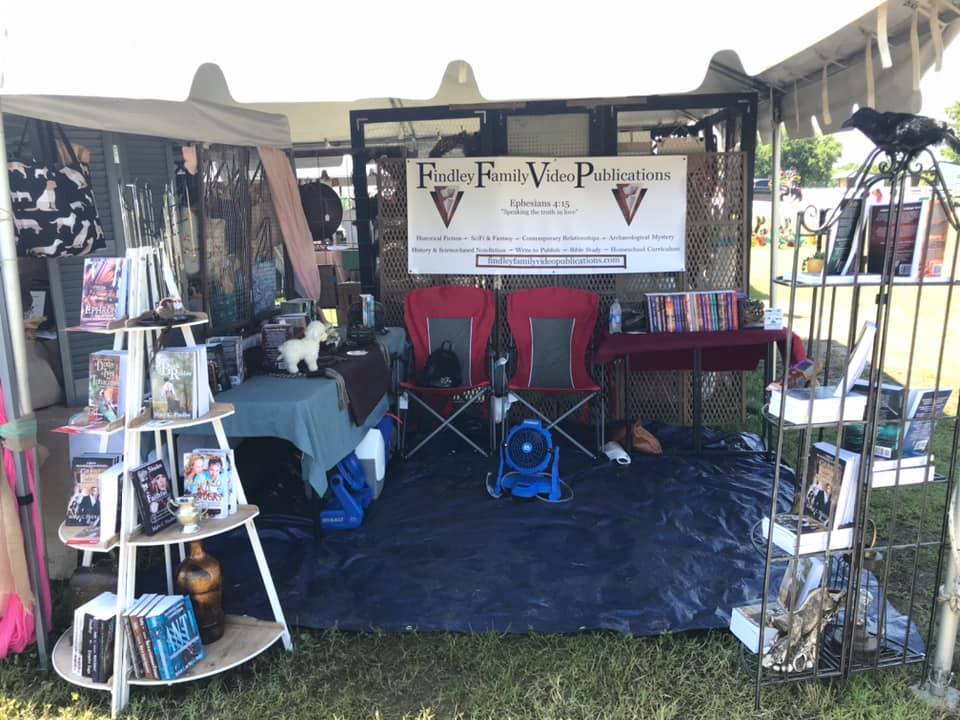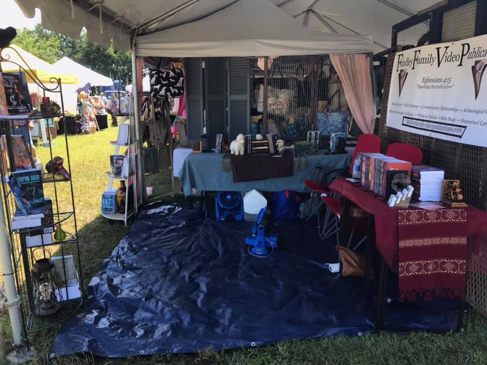 We had a 10×10 space under a “festival tent” awning the owner provided. The cost was far less than we have paid at homeschool conventions, but rain had been soaking the area for a couple of weeks before and most vendors had water or squishy ground in or near their booths, especially when a surprise storm hit the area overnight into the second day.